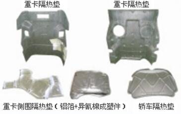 汽车隔热垫的属于汽车内饰件技术领域.其主要选用低直径玻璃丝制成的玻璃棉和大直径玻璃丝制成的玻璃纤维毡作为基材,经过嵌料,铺料,压制成型,冷却定型,再经水刀切割,检验得到产品汽车隔热垫.本发明满足了隔热垫的吸音,耐热性,轻量化,刚性高等性能指标要求,大大降低了隔热垫重量,满足了整车低重量设计的要求.铺料工序中,采用手工铺料,可以弥补玻璃棉和玻璃纤维毡的面密度不均匀的缺陷;产品的刚性高,产品不易折裂,变形;原材料采购成本低,满足了整车低成本设计的要求。